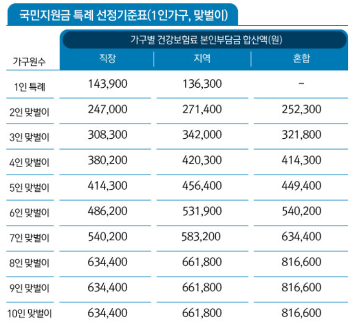 1인 가구 직장가입자는 14만 3900원 이하, 지역가입자는 13만 6300원 이하면 지급 대상이 됩니다. 맞벌이 가구는 외벌이 가구 기준에다가 가구원 수 1을 더해서 산정합니다. 예를 들면 직장가입자인 3인 맞벌이 가구는 4인 외벌이 가구의 기준인 30만 8300원 이하일 경우엔 지원금을 받을 수 있습니다.