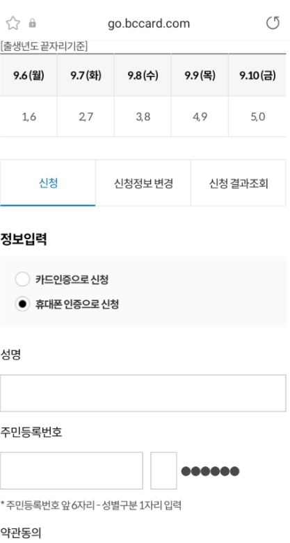 휴대폰 인증으로 신청하시고 아래 정보를 입력해 주세요