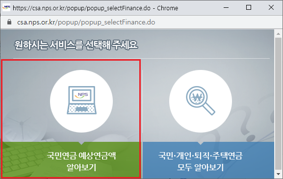 아래와 같은 팝업 안내가 나타나면 좌측의 ‘국민연금 예상연금액 알아보기’를 선택합니다.