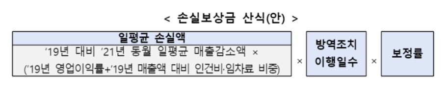 소상공인 손실보상금의 계산법은 [일평균 손실액 X 방역조치 이행일수 X 보정률]로 적용합니다.